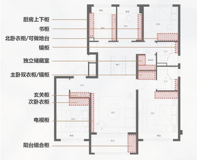 四室户型必须经受考验的地方就是收纳空间,作为一个可以伴随家庭一起走得更远的户型,收纳上,一方面需要兼顾从大件到日常的收纳需求,也要具备调整适应的可能性。