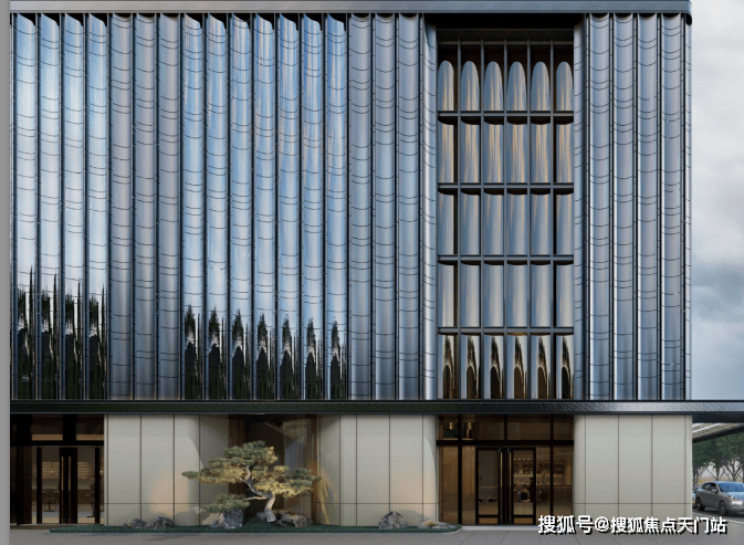 项目会所立面用的 流光幻彩铝板,不同角度有不同颜色呈现,“缺点”就是昂贵;大堂的玻璃也很吸睛,用的 半钢化夹胶反弯弧玻璃,半径仅为约600mm,施工难度大、成本高,只为更好的效果。