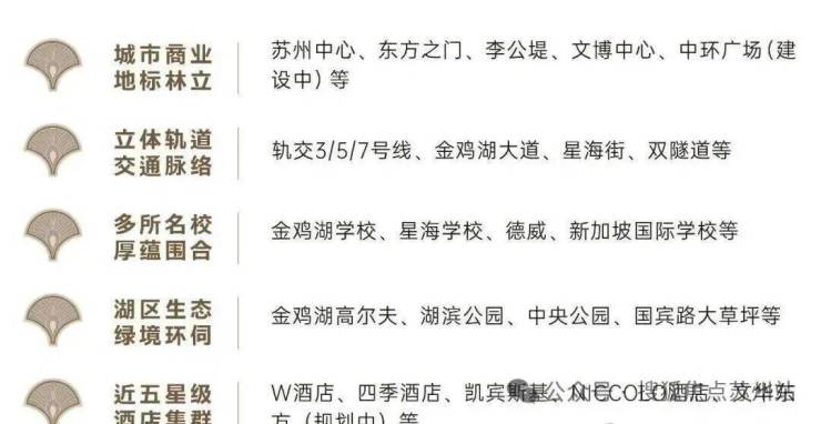 坐揽金鸡湖与独墅湖城市地标、商业旗舰、城市公园、五星级酒店、文化剧院等繁华盛景,苏州中心、东方之门、中环广场等地标配套环湖而立,奢享开放包容的国际滨水生活圈。