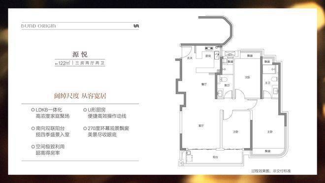 建面约122㎡3房2厅2卫,非常标准的动静分离、三开间朝南户型。几乎保留了前一个户型所有的优势,但在尺度感、私密性和舒适度上又有突破,不管是采光、视野、通风、私密性,还是实用性都十分出色。主卧拥有270度环幕观景飘窗,视野和采光都非常好。
