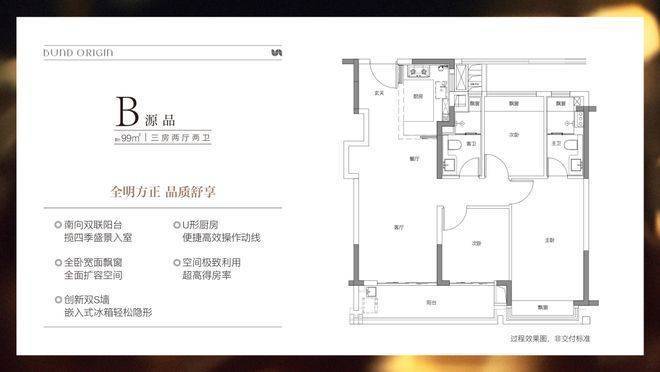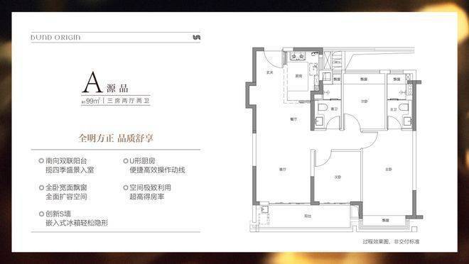 建面约99㎡3房2厅2卫,非常标准的动静分离、三开间朝南户型。"分户s墙"设计在分户墙处增设“凹型空间",“冰箱外移"增加厨房操作台面和收纳空间,创造更合理的餐厨桌台动线。三开间朝南+南向双阳台设计+全卧室带飘窗,为整个户型带去非常出色的采光,同时室内视野的延展性很强。动静分离则是把功能区与休息区分割,加上主卧套房的设计,让业主有更好的私密性和生活舒适度。