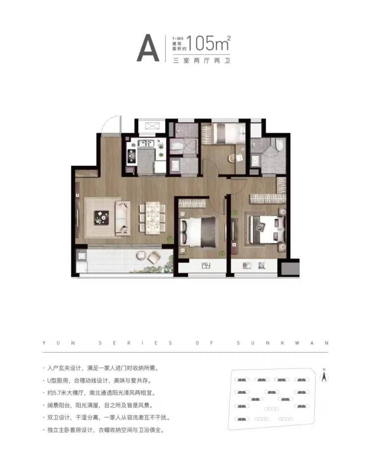板块最优户型:105,三房两厅两卫