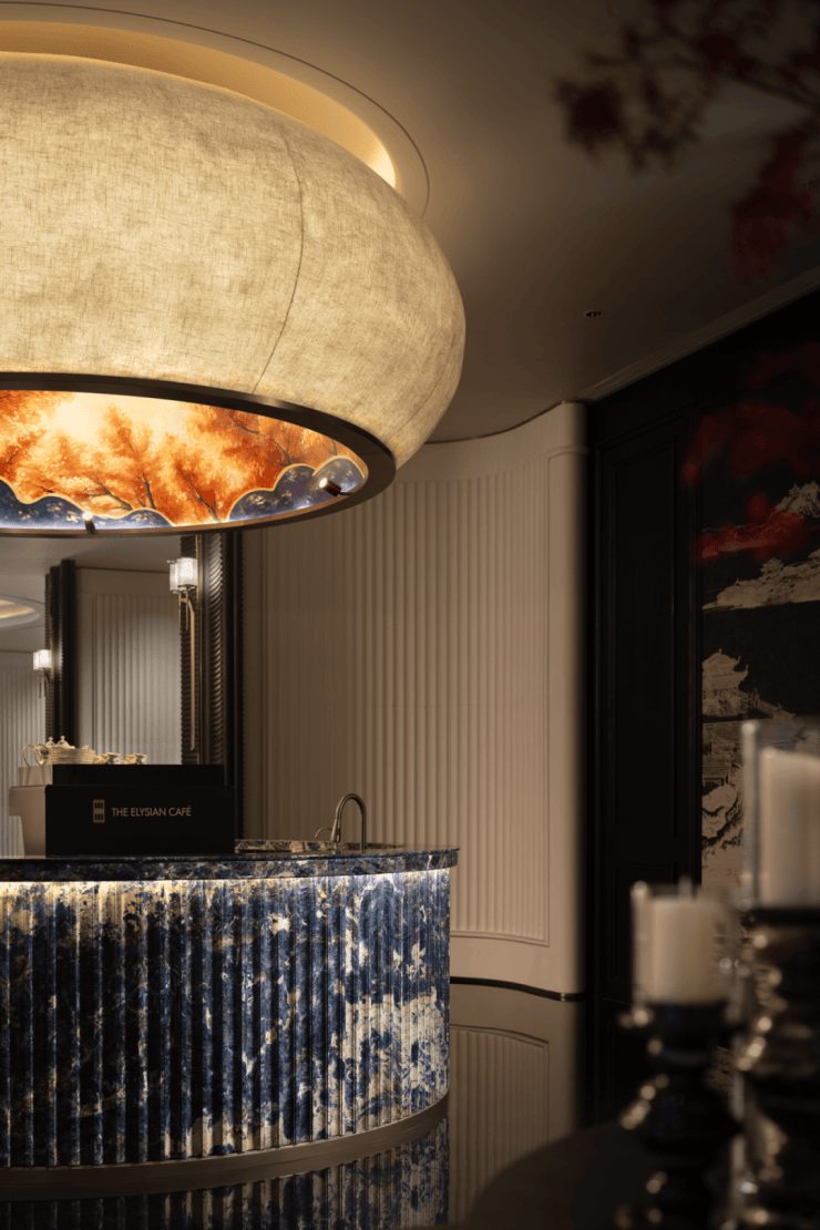 来到水吧区域,这里的中式艺术更加精彩,仿佛是陶瓷一般的图案,也有着湖水的模样,自然和艺术融入功能之中。