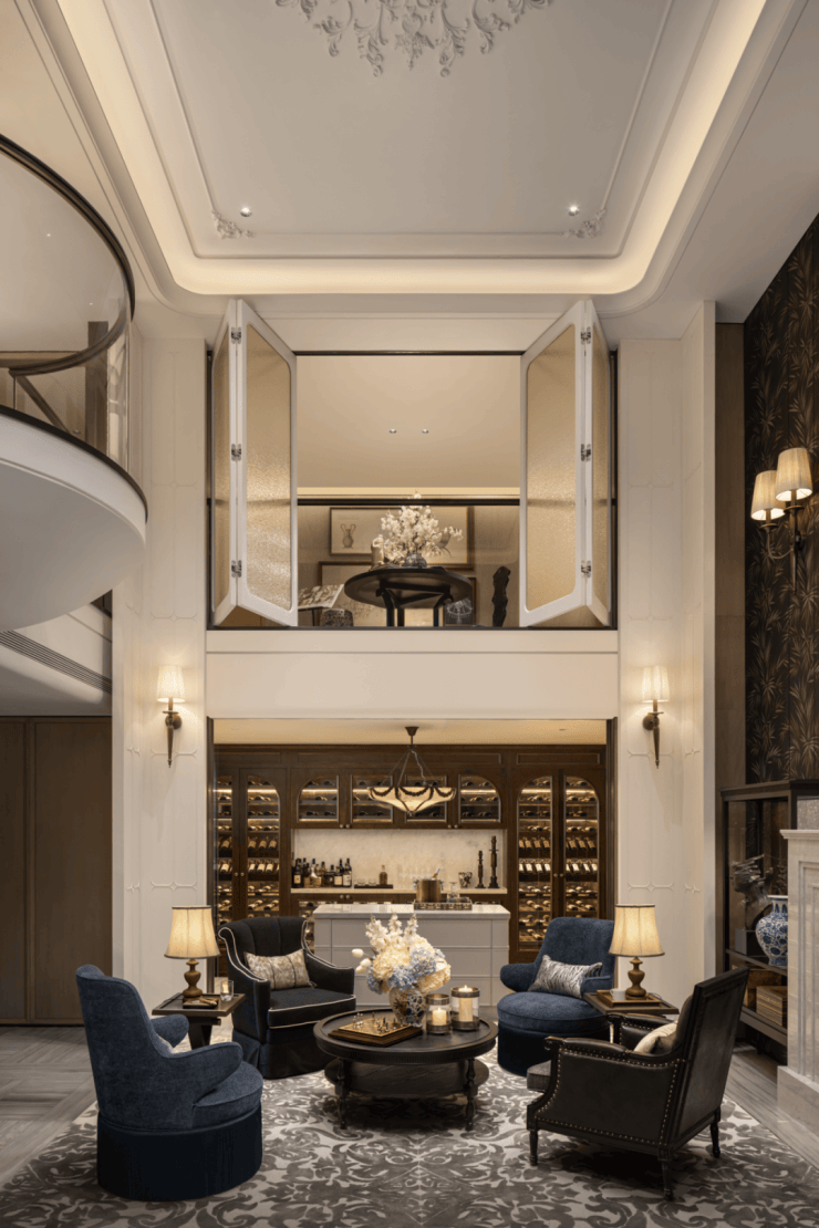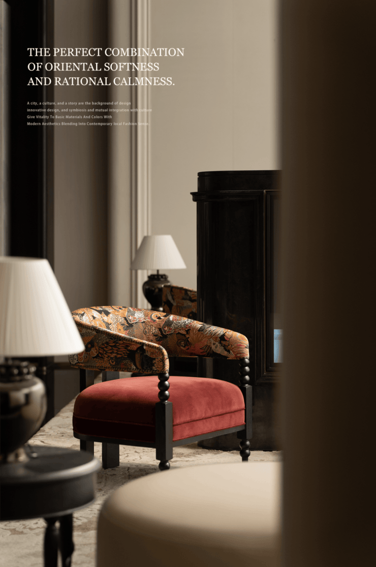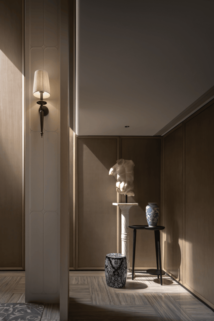 天花板为法式的圆弧设计,墙面背景为中式的沉稳大气,不同细节的组合方式彰显治秩序,也融入不同文化精髓。