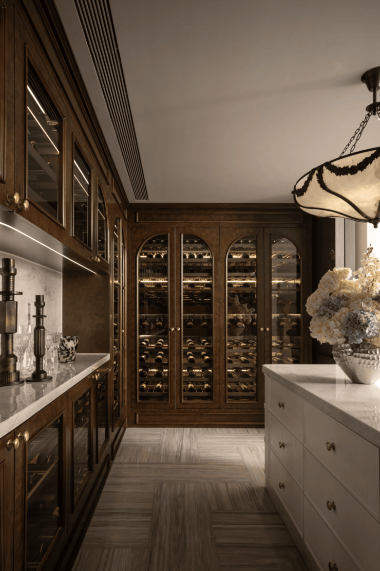 名贵的美酒整齐摆放在收纳架内,实木和金属元素搭配,营造出奢华气息。美酒的尊贵感也成为艺术的元素,呈现出生活品质。