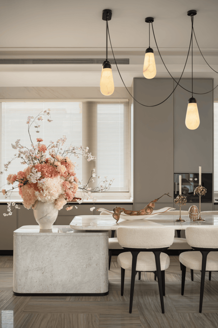 餐厅的展示台延伸出餐桌桌面,上边摆放着花卉艺术品。白色毛绒座椅十分浪漫,简单的烟火气,也拥有甜美的故事。