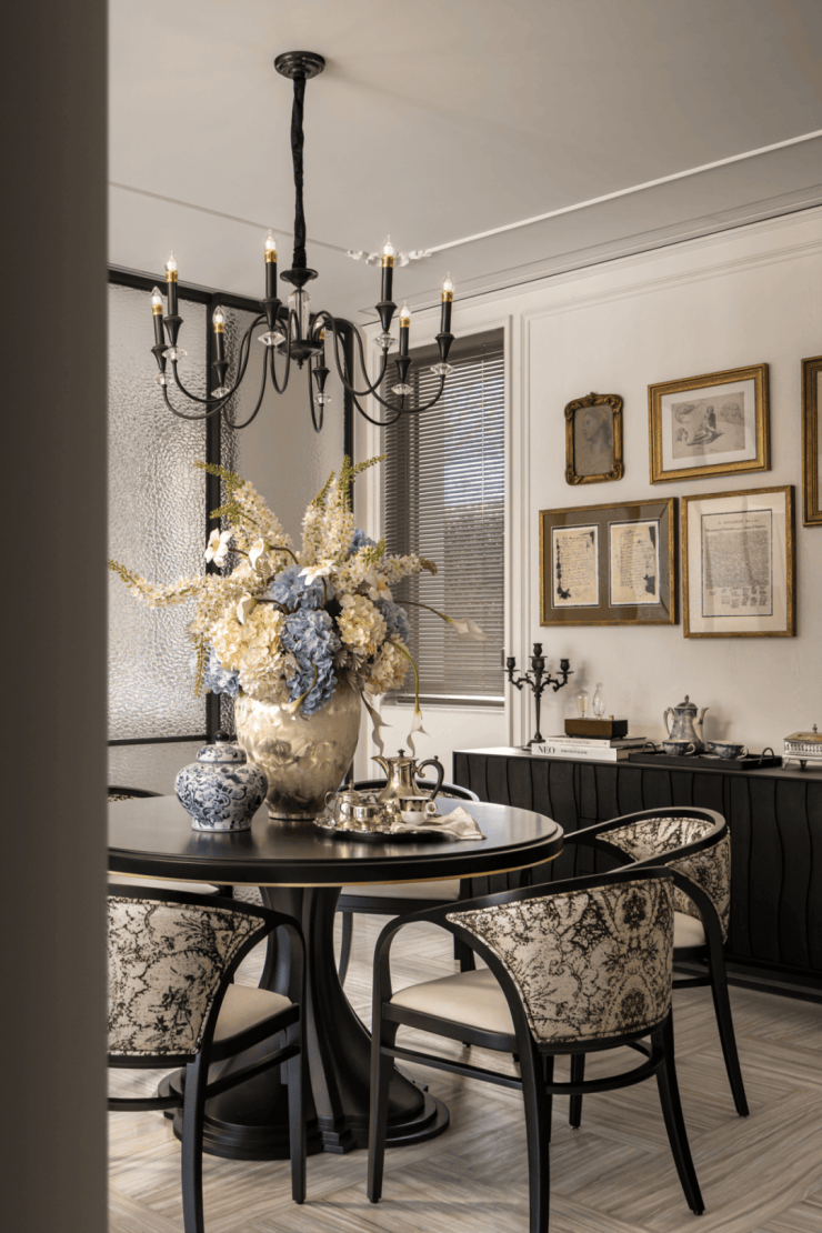餐厅区域的氛围依然优雅浪漫,吊灯采用烛火样式,而黑色圆桌增加沉稳气息,艺术画和座椅表现出中西风格的融合。