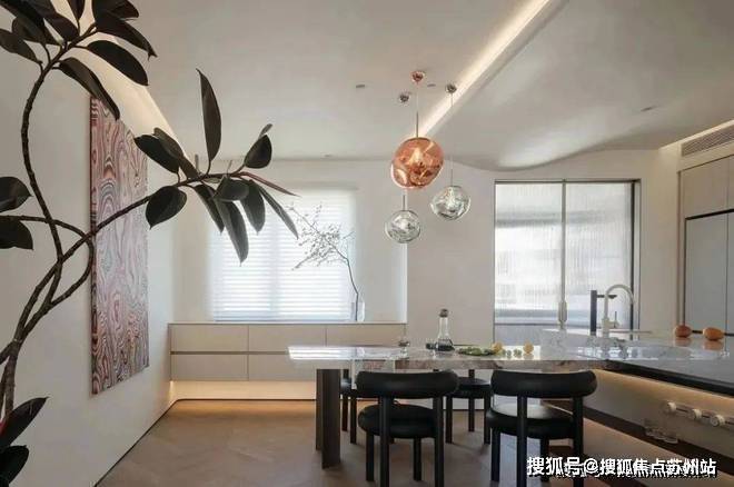 空间与光线的友谊沿着极简走向无尽.嵌入式厨电,使得布局更加开阔明了,将突兀二字尽数抹去.泼墨大理石台面由几抹亮色点缀,奢雅之中巧露活泼生动.