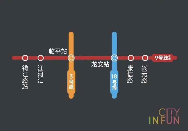 项目横跨地铁9号线兴元路站(在建)、康信路站(在建)两大站点,以轨道打破壁垒,一条地铁直达钱江新城、城东新城、滨江、西湖等高能区域,更高效的日常通勤外,还能享受到一脉市心的生活配套。