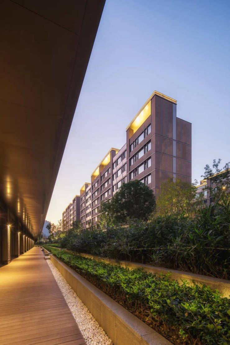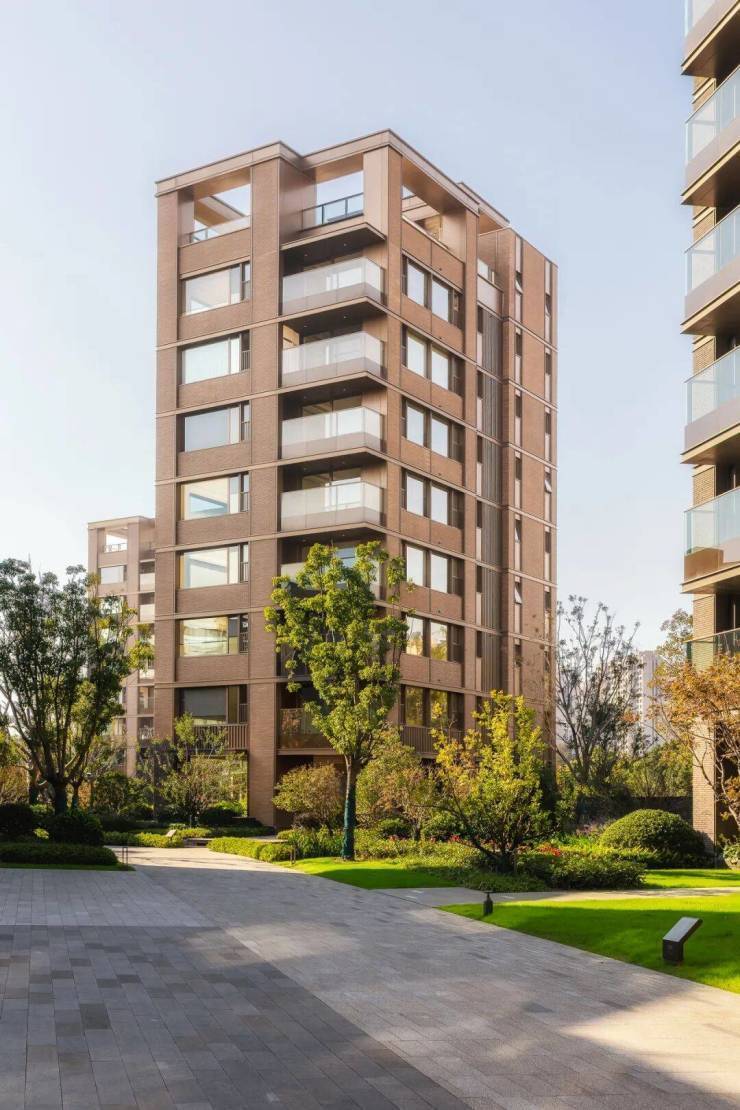 外立面方面,项目采用优雅的干挂陶砖幕墙,结合铝板的质感,演绎独树一帜的褐色美学符号。园林景观采用“一谷五情境”设计概念,致敬海派文化,将老上海的花园意境通过现代手法复刻,呈现洋房的慢生活。