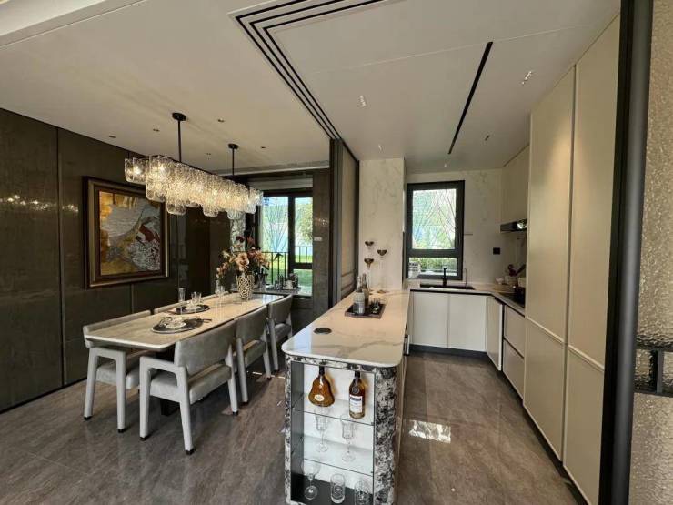 招商中旅·观境的解决方案是“零无效空间”。通过整合餐客厨等公共区域厅,将原来南北厅中间的走廊空间融合到使用空间中,减少过道的面积,避免碎片化的空间带来的冗余浪费。大面宽,短进深,餐厅与客厅横向相连,每一平方米都物尽其用,把客厅升级为家庭互动主场。