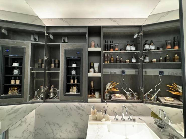 双卫配置,其中一个做了干湿分离,科勒台盆+双智能马桶+高仪花洒,除雾镜柜均内置了牙刷消毒器、预留吹风机插座。主卫镜柜还有美妆冰箱,收纳空间相当充足。