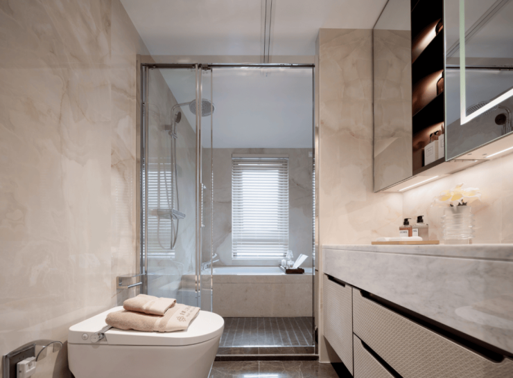 卫生间内,标配国际一线的汉斯格雅五金、杜拉维特卫浴套装和恩仕AXENT智能马桶。