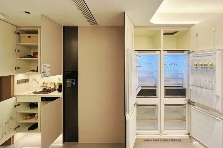 客餐厅设计约9.8m超级收纳墙(非交付标准),收纳空间充足!冰箱置于“S”墙内,不占厨房空间,实现空间利用最大化。