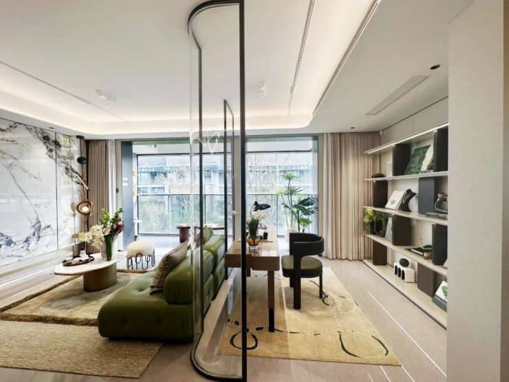 厨房、餐厅、客厅及阳台一体化设计,更促进家人间互动交流;室内3米层高+多功能宽景阳台,样板间将书房隔断墙做了玻璃屏风格挡设计,宽厅的空间感更通透!