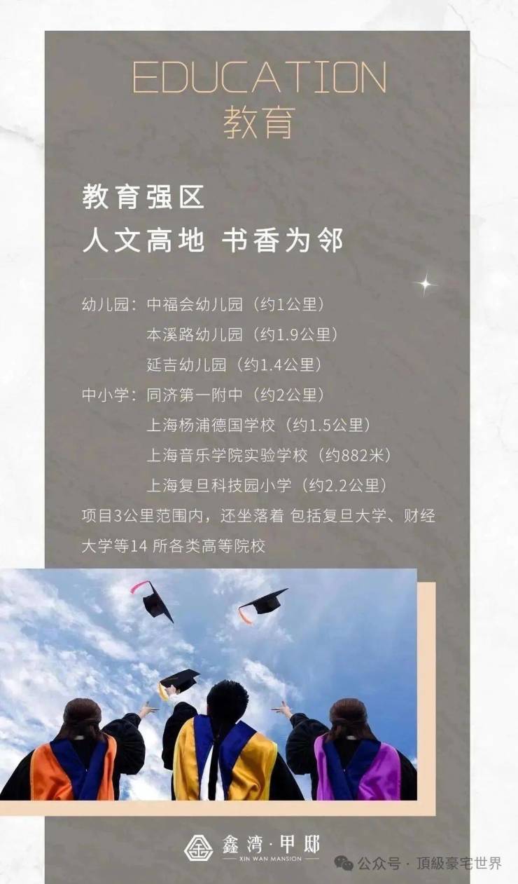 教育配套,幼儿园中福会幼儿园 (约1公里),本溪路幼儿园(约1.9公里),延吉幼儿园(约1.4公里),中小学同济第一附中(约2公里),上海杨浦德国学校 (约1.5公里),上海音乐学院实验学校 (约882米),上海复旦科技园小学(约2.2公里)项目3公里范围内,还坐落着包括复旦大学、财经大学等14 所各类高等院校。
