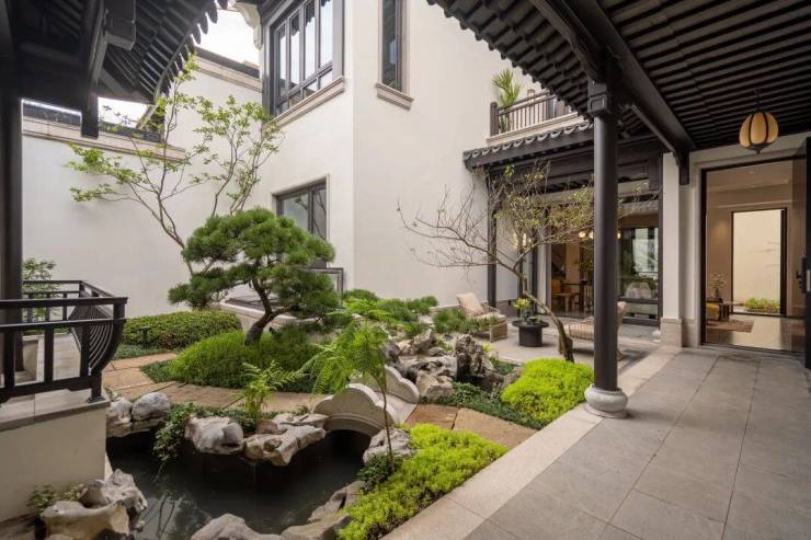 当然,在产品上大尺度的面积段让设计游刃有余。项目部分大户型利用地形,形成“双庭院双首层”,“室内空间”直接延伸至庭院,讲究一个气韵空灵,场域开阔,足以匹配高端人士身份。