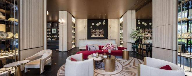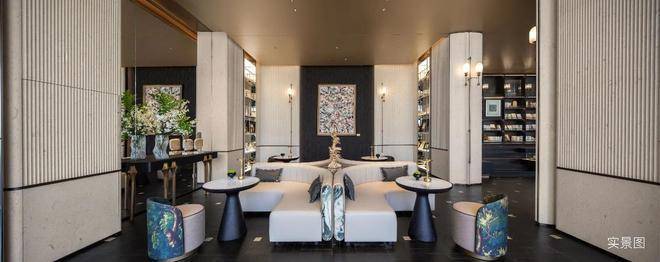 还有挑檐设计的架空层泛会所、地下车马院、艺术长廊,以及贝金米黄石材、水纹玻璃、海浪灰花岗岩、约12m通高落地玻璃……