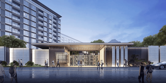 小区三面环水,依水而居,有着半岛奢居住新体验,融合自然、都市、生活,充分利用临水优势,营造“五境”的静谧奢雅的生活方式。入云间,尊享酒店式入口;转碧茵,繁盛山水迎接归家入户。