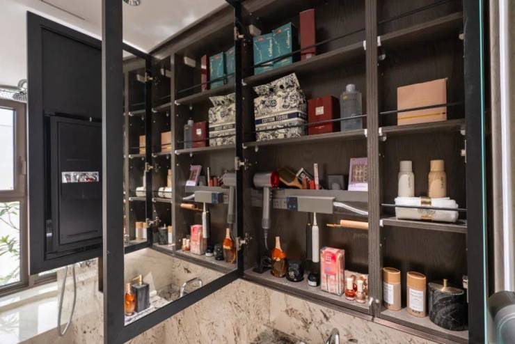 另一侧的储物柜是一个容量较大的落地柜,足够收纳一个大行李箱,背面还贴心设置了洞洞板,可以悬挂雨伞、包包等物品。值得一提的是,整个玄关柜是天然木皮鸡翅木包裹,用料昂贵。并且与墙面、地板几乎一个色系,营造一气呵成的视觉观感,传递出一种低调内敛的豪华感。眼前一亮的是卫生间收纳,项目的镜柜是内外双镜,并且内部的收纳空间相当丰富,小到女主人的发箍、面膜、口红、香水,大到吹风机都有适合的位置。