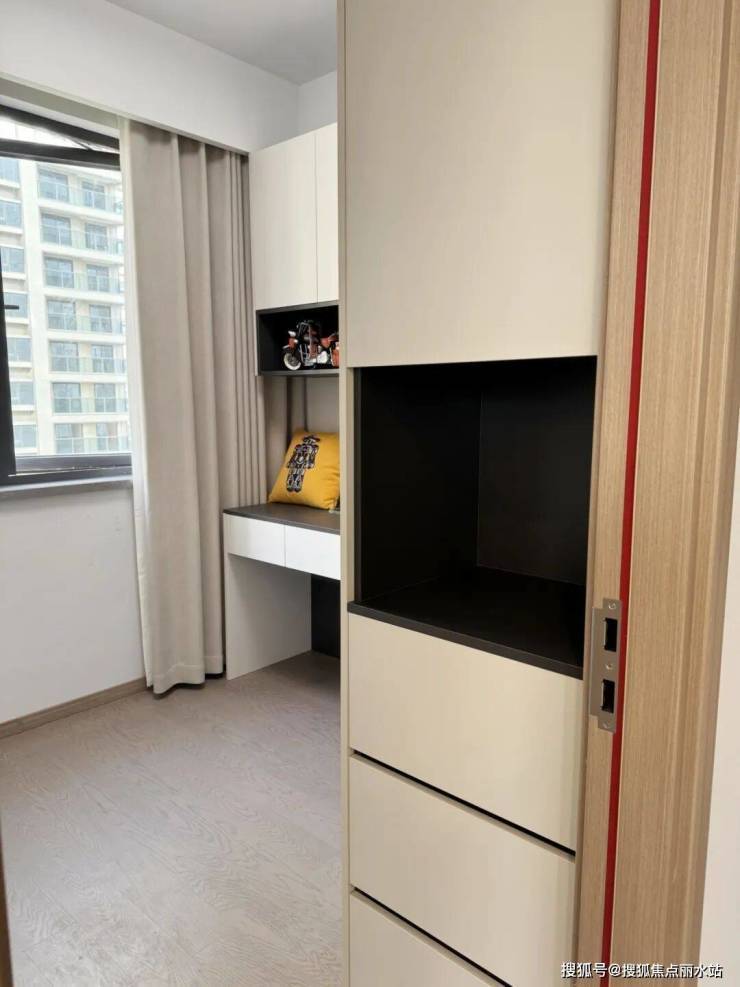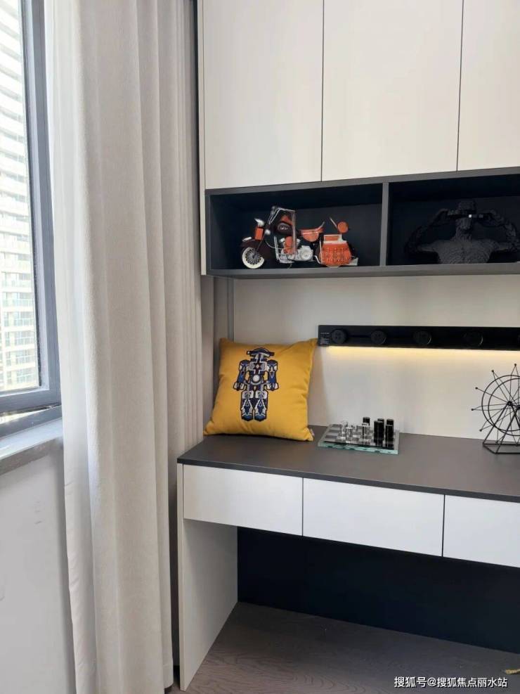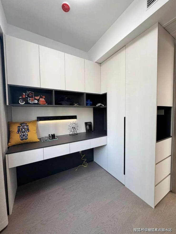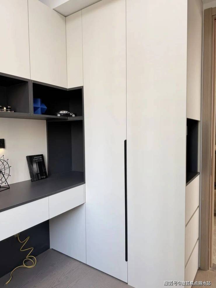 再进来呢,右手边的房间是做成一个书房+衣帽间,进门右手边贴墙做了一组衣柜,进门斜对面做了一张大书桌和吊柜,同时满足办公和收纳。