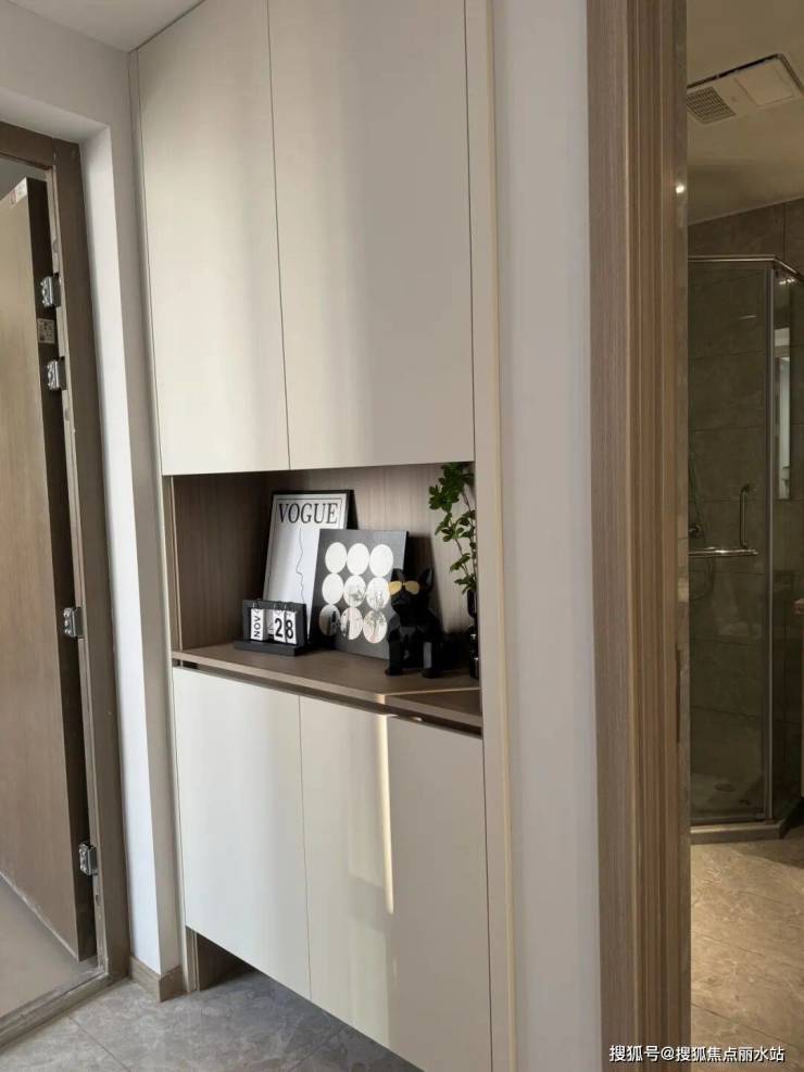 一进门,左手边就是一个入户玄关鞋柜,上面可以作为储物柜,下面是鞋柜,柜子里的层板设计成可拆卸的活动层板,这样后期可根据不同款式的鞋子自由调节层高高度。中间设计开放格,用来放一些展示摆件、香薰,提升仪式感。最下面是开放区,这么设计的好处就是换鞋方便,早上出门再也不用急急忙忙开柜子找鞋了。