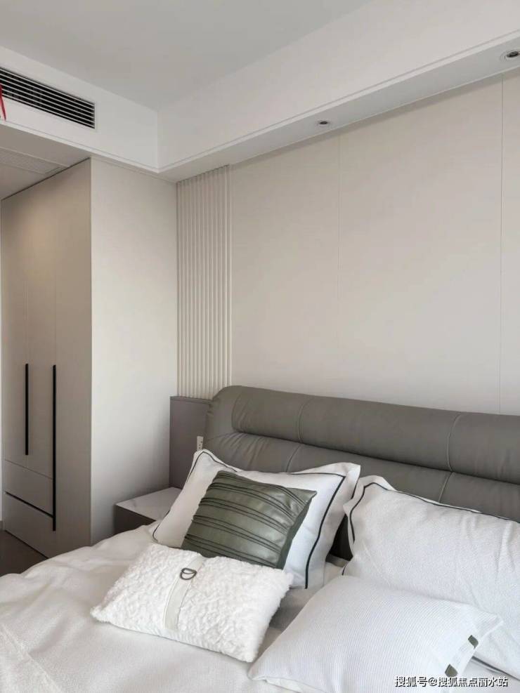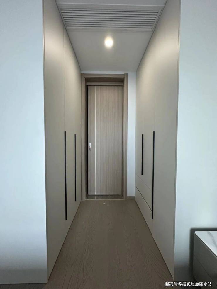 主卧,卫生间门外过道做了双排衣柜,一侧一门到顶,一侧分段式设计,收纳更为方便、整洁,整体统一色调,宛若一体。