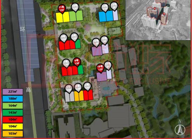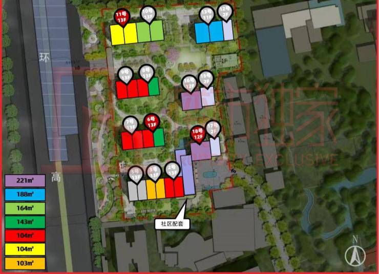 西郊云庐本次首开楼栋为6号、11号、18号楼,其中18号为221㎡大户型,其余均为104-143㎡户型,具体分布位置如下: