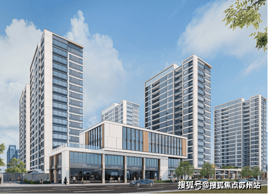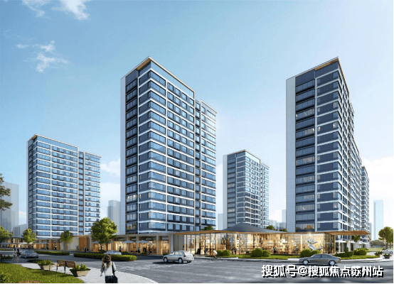 晴萃府的外立面采用深灰色涂料,部分为石材干挂和香槟色铝板干挂,这种颇具高级感的外立面,确保了建筑现代简约的风格。