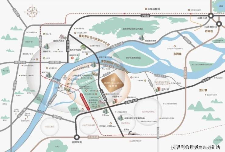 状况紧邻富春湾新城中轴线大桥南路,城际铁路(规划中)约1千米,富阳高铁站约3千米,未来新城区域内还有3条高速路在建。周边