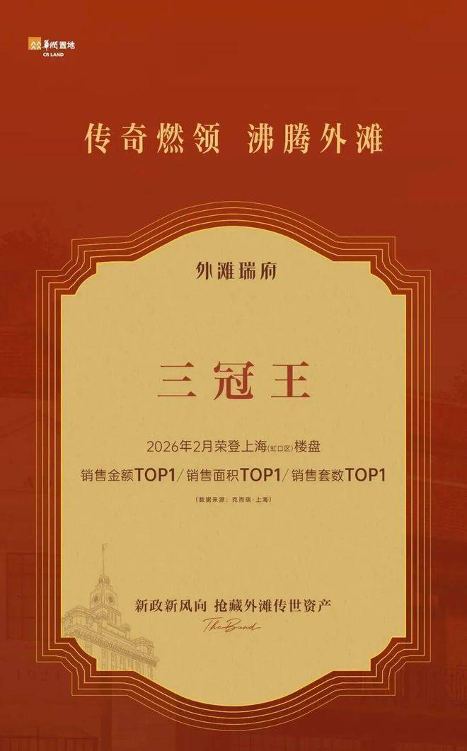 外滩瑞府荣膺2026年2月虹口区新房三冠王。