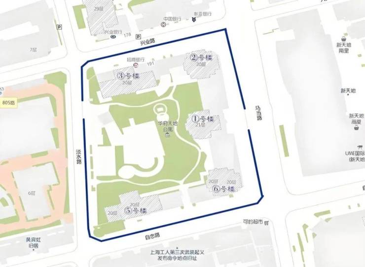位于黄浦区(老卢湾区)马当路222弄,重庆南路高架东侧,东起马当路,南临自忠路,西靠淡水路,北至兴业路,与上海新天地正对面相望,地理位置得天独厚,尽享城市核心资源。