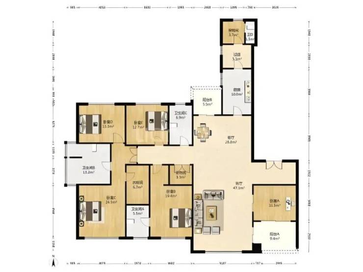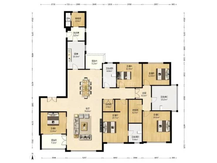 -3号楼02室:276㎡,4房2厅3卫,客厅南北通,两房朝南两房朝北,尺度宜人。
