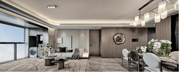 约154㎡4房2厅3卫设计,整体格局方正,南北通透,四开间超14米奢阔尺度,阳光清风肆意流淌。约9.9米阔绰LDKB一体化空间,大尺度的竖厅设计,容纳多元家庭欢欣团聚。