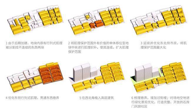 作为焕新的第一步,建筑师将得发里、鹤寿里以及永和邨南北向的建筑全部平移到地块中央进行肌理织补,拉通了原有未贯通的东西向巷弄,使行列式肌理达成连续性,并且扩大了文保部门认定的肌理保护范围。
