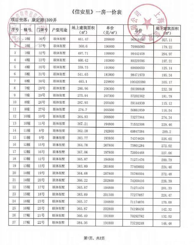 一房一价表如下