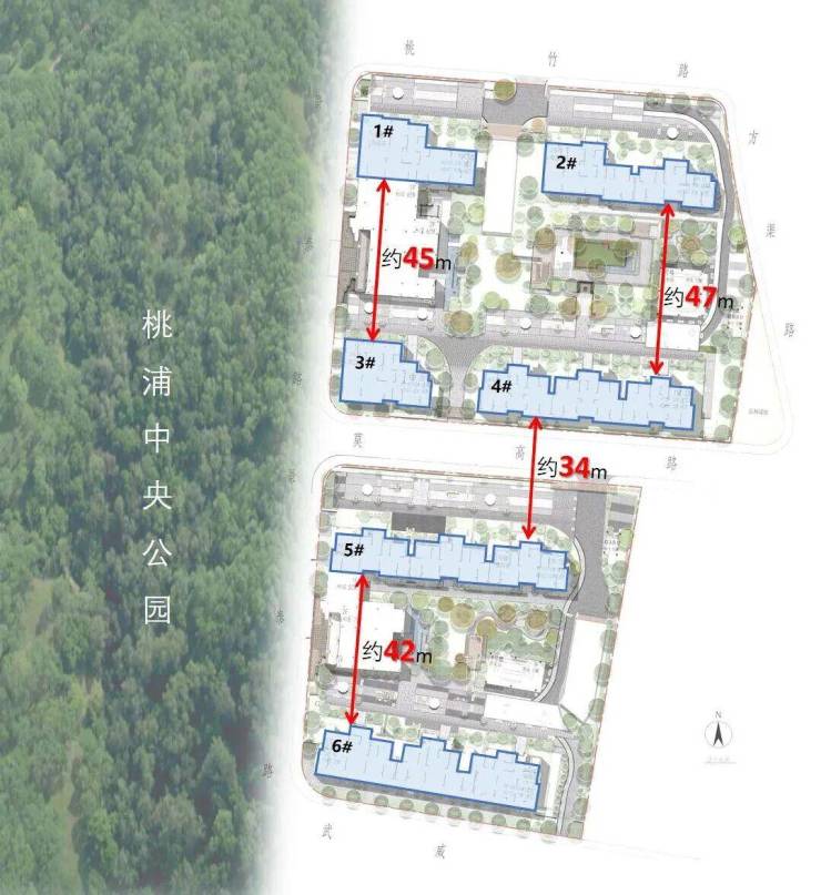 项目整体规划6栋小高层,以低密度布局营造舒适宜居氛围。楼间距约34-47米,远高于同类项目标准,不仅显著提升了室内采光与通风效果,也为中间及东侧户型留出了宽阔的视野通廊。