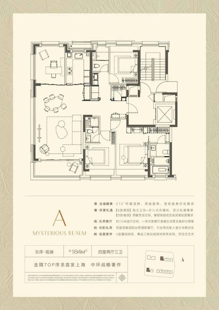 建面约184㎡的A户型,为四房两厅三卫配置。