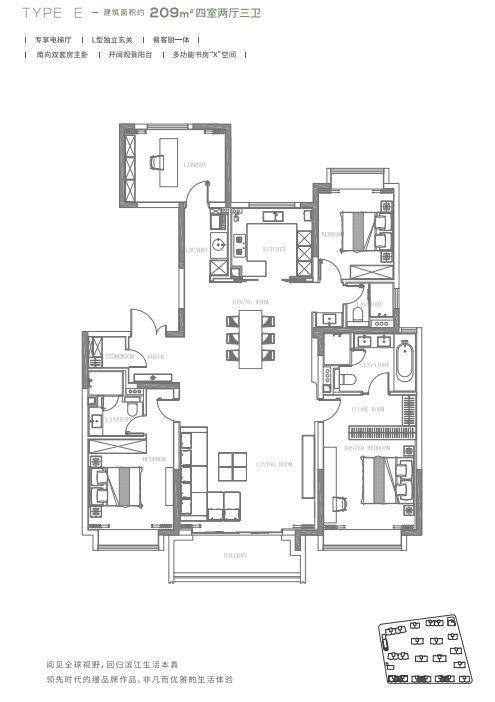 五房三卫设计,层高3.5米,配备劳芬卫浴、博世厨电等国际品牌精装,部分户型带空中花园或露台
