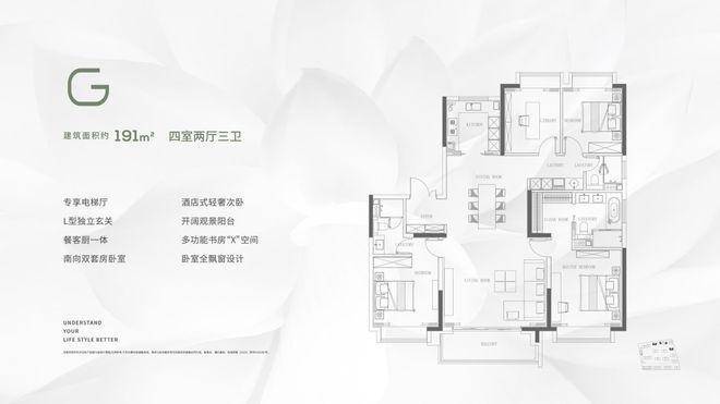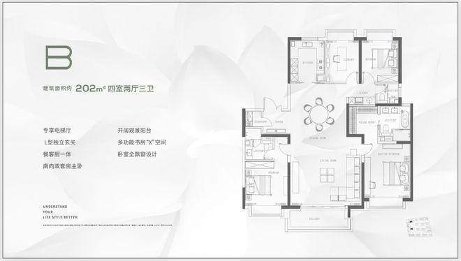 四开间朝南,主卧双衣帽间+独立卫浴,客厅面宽达6.5米,部分户型配备多功能书房或家政间