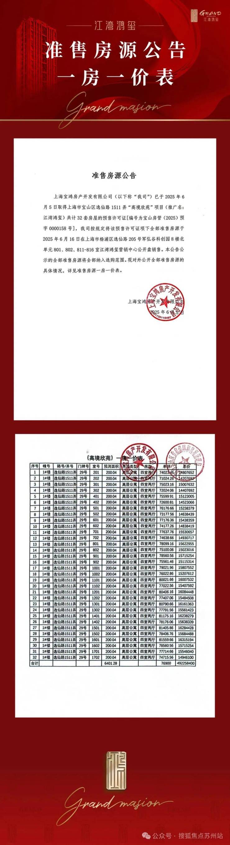 最新消息,宝山高境「江湾鸿玺」在售中!推出建面200㎡大平层,总价约1420万起!