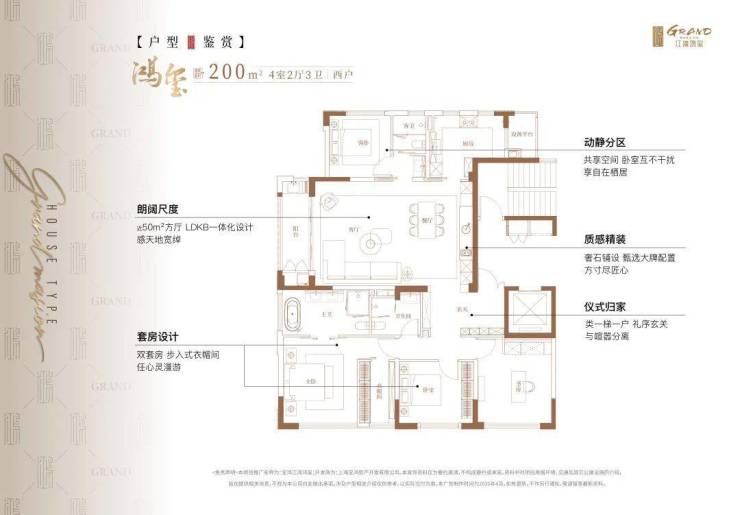 户型设计上,类一梯一户,方厅近50㎡,主卧超级套房。