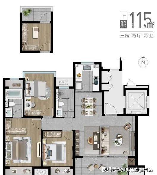 该户型还有一个亮点,就是南北双阳台的设计,北阳台既可以保留,也可以打通作为卧室、书房、游戏室,根据业主的需求,随心而定。