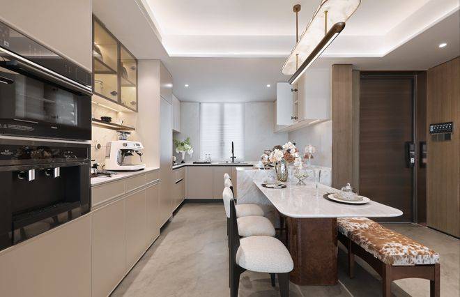 在厨房,燃气探测器与水浸传感器实时守护厨房安全,异常即时告警至手机,将安全隐患阻隔于未然;客餐厅及主卧预装智能屏一键调控,更预留了强大的后装升级接口,将与您的需求一同成长。