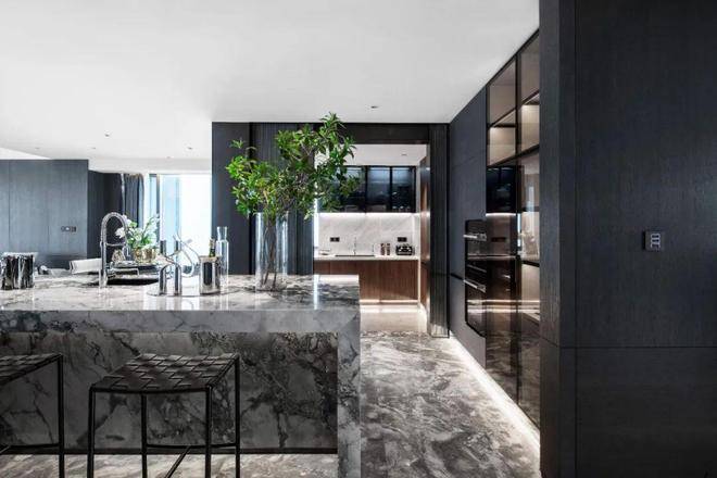 德国柏丽nobilia整体厨房,烤漆门板的选型为杭州壹号院量身定制,仿岩板色与深色木纹的搭配相得益彰,并加上柏丽的深色玻璃吊柜。
