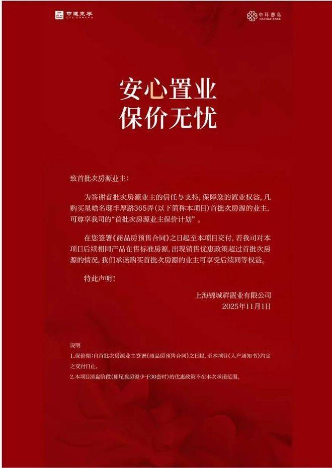 上海第二个作出“保价”承诺的项目,11月1日,中环麓岛项目也发布了公告:凡购买首批次房源的业主,可享“首批次房源业主保价计划”: