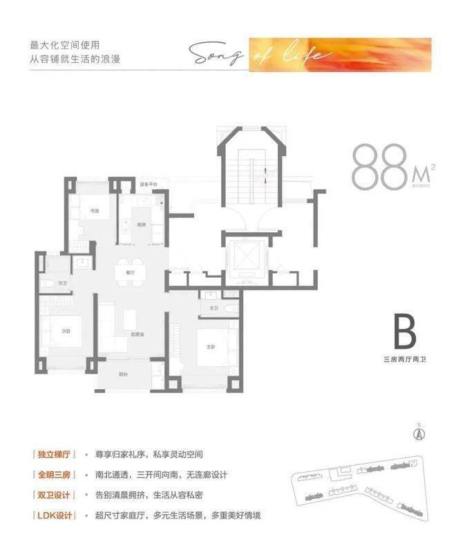 该户型竟做到惊人的3房2卫,你要知道88㎡常规户型要么是2房1卫,要么3房1卫