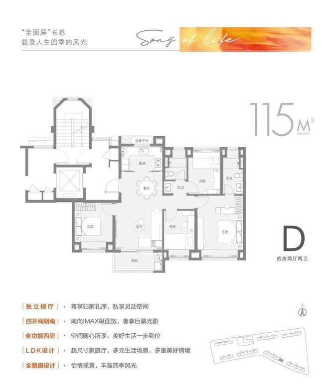 该户型做到了同面积段罕见的四开间朝南+四房设计南向IMAX级景观面,卧室阳光满溢,功能性也拉满.