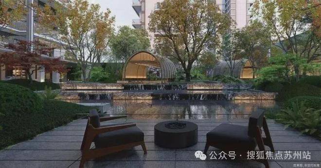 摩登江南园林:约5万方立体园林,融入乌篷船、苏绣等苏州文化符号,并选用西班牙珊瑚红奢石、百年古树等高端材质。