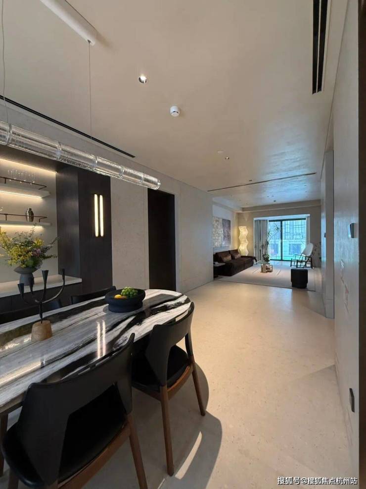 项目层高突破传统住宅达到约3.3米,空间感十足!搭配墙面、地面选用的米白色天然石材,以及顶部特殊的圆弧造型,通透造型空间尽显塔尖气质。